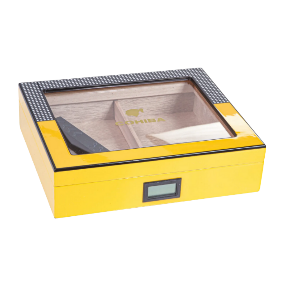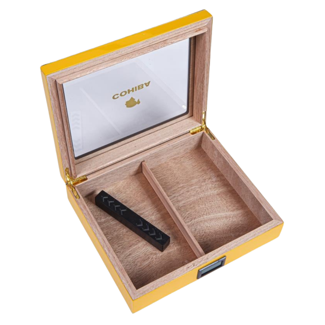 | Ürün İçeriği: | Cohiba Sarı Camlı Küçük Boy Humidor Puro Kutusu, Puro Nemlendirici, Dijital Nem Ölçer |