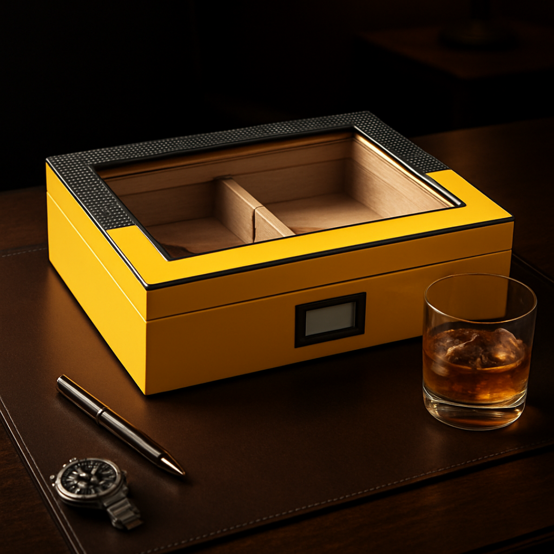 ㅤㅤHumidor Puro Kutumuz, puroları doğru koşullarda saklamak isteyenler için tasarlandı. Tamamı İspanyol sedir ağacından üretilen iç ve dış yapı, aromayı korumaya ve ideal nem dengesini sürdürmeye yardımcı olur. Puro nemlendiricisi ve dijital nem ölçeri, puro kutusunun içindeki ortamı her an kontrol altında tutmanı sağlar. 30 puroluk kapasitesi, purolarınızı güvenli ve düzenli şekilde saklamanız için ideal bir alan sunar. Sade ve maskülen çizgileriyle bu humidor, puro keyfini her zaman doğru koşullarda yaşamak isteyenler için güvenilir ve seçkin bir parçadır.